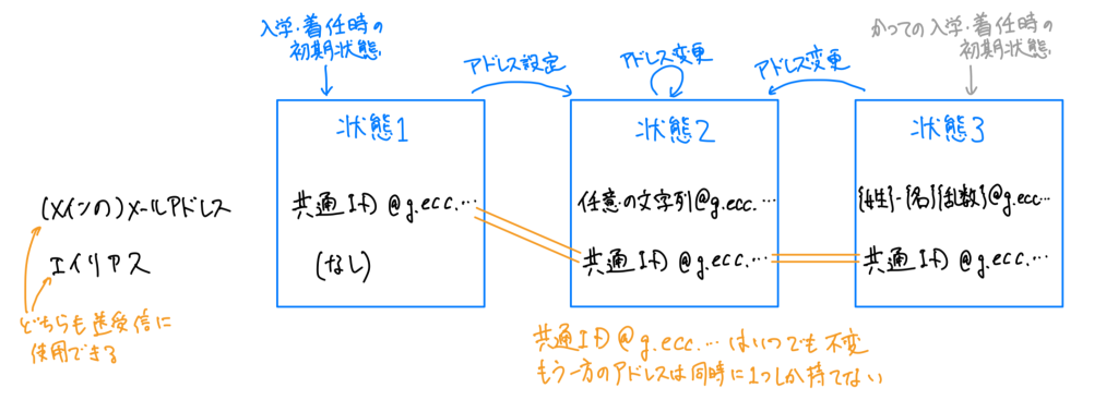 ECCSクラウドメールでは、「自分で考えたメールアドレス」を変更すると旧アドレスは無効化されます。そのため、旧アドレスに宛てたメールは届かなくなります。一方で、案内にてエイリアスとして機能すると記載があったのは、初期設定の「10桁の共通ID+@g.ecc.u-tokyo.ac.jp」というアドレスです。